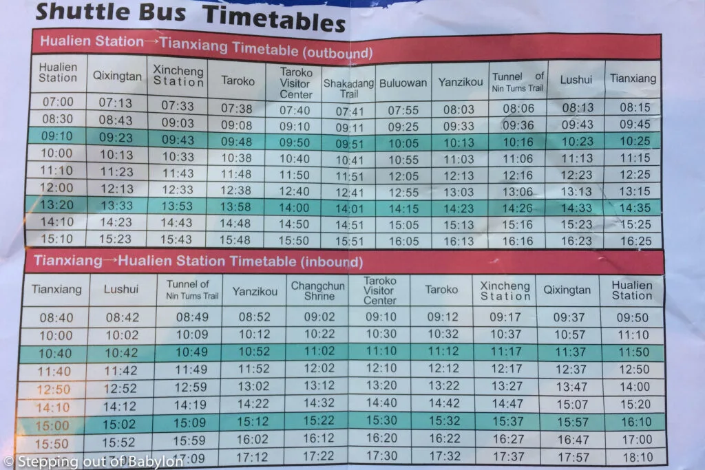 Don’t expect the buses inside Taroko Gorge to be perfectly on time — delays are common and tend to get worse the further you go, especially near Tianxiang.