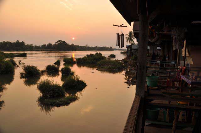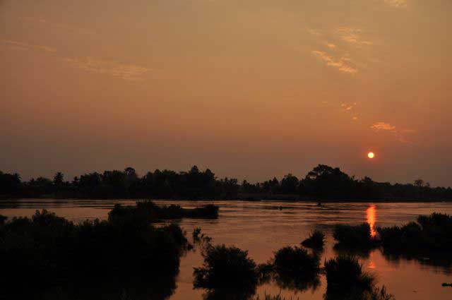 Foi uma forma de terminar calmamente a estadia no Laos, onde da varanda do bungalow onde me instalei pude apreciar intensos nasceres-do-sol, sempre envolvidos por uma suave bruma, que só deixava ver o tom laranja do sol quando este já se afastava um pouco da linha do horizonte. Do outro lado da ilha, numa zona menos densamente ocupada por bungalow pôr-do-sol constitui outra atracção, numa zona onde a paisagem do rio é mais ampla e com menos ilhotas.